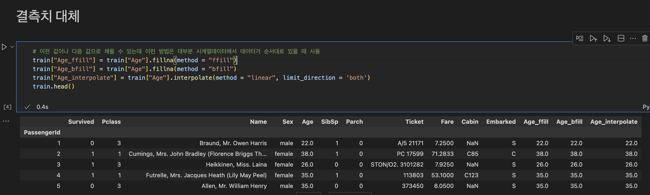 df.interpolate: 주변 값을 이용하여 결측치 처리