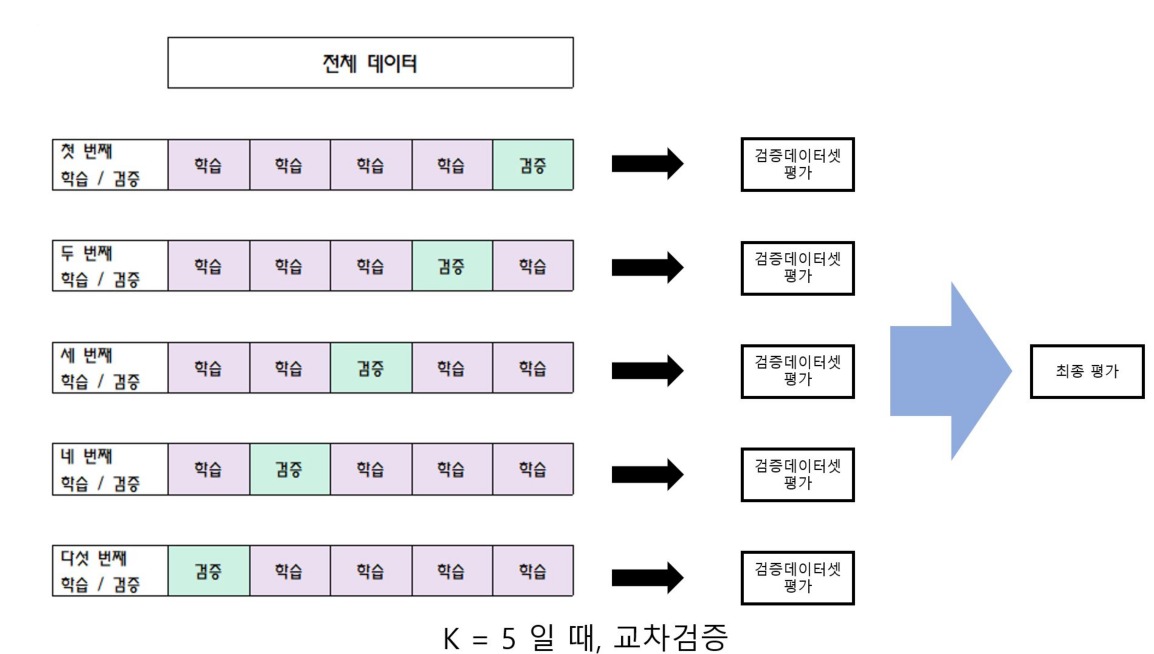 교차 검증으로 train 데이터를 분할하여 학습과 검증을 반복한다.